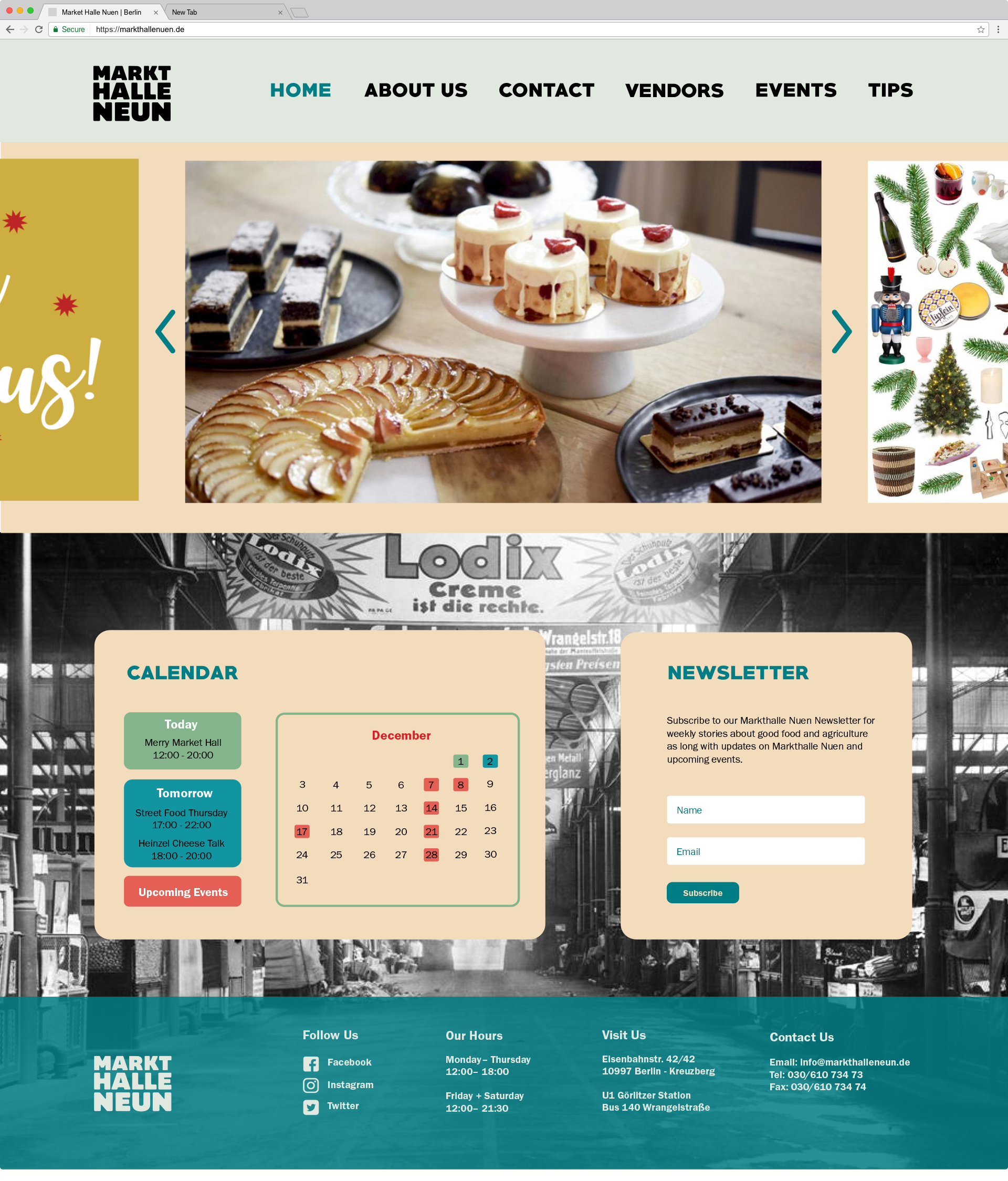 Markthalle Neun is a farmers market in Berlin that is located in a historical building, it brings together a diverse range of vendors, food and people to create a unique and vibrant environment. The Markthalle Nuen website is to prepare visitors for their next visit and inform them of vendors and upcoming events.